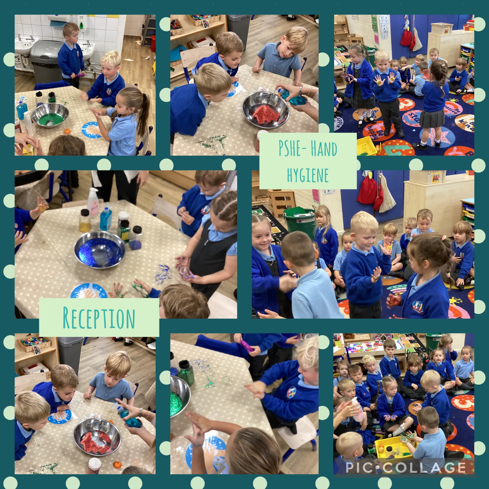 This week in PSHE we have been learning all about how important it is to keep your hands clean and how germs pass onto different people and objects. We used different coloured glitter on our hands and practiced hand shakes and ‘high fives’ then touching objects and pieces of fruit to see how the germs mixed and spread. We then put glitter in a bowl of water and added a drop of soap to disperse the glitter and demonstrate how the soap kills the germ and why it is important to wash our hands with soap and water.