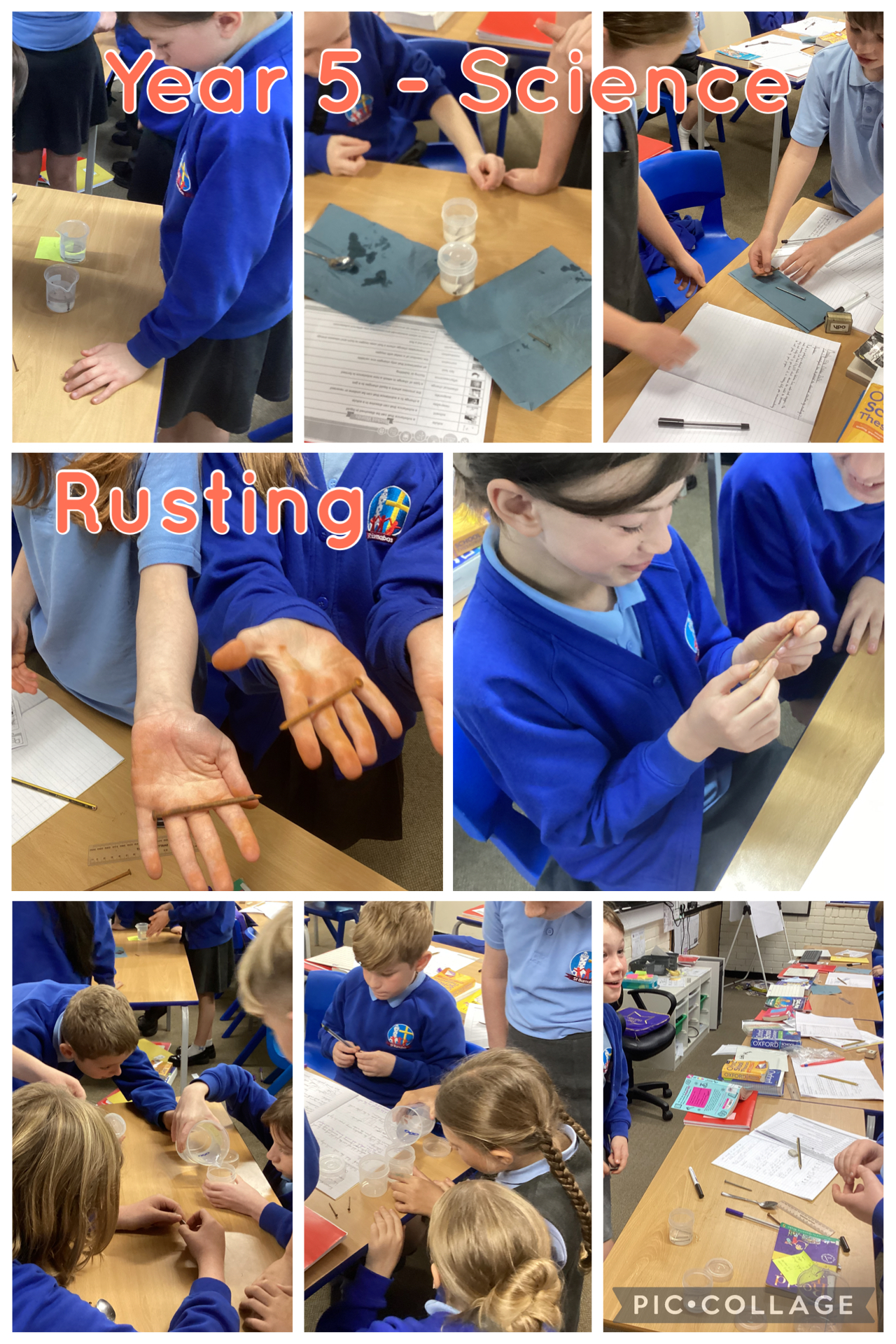 Year 5 continued learning about chemical reactions by exploring rusting: the reaction between iron, water and oxygen to produce a new substance. The children defined rusting and corrosion before starting an experiment to see how the reaction can be sped up using saltwater or slowed down using painted iron.