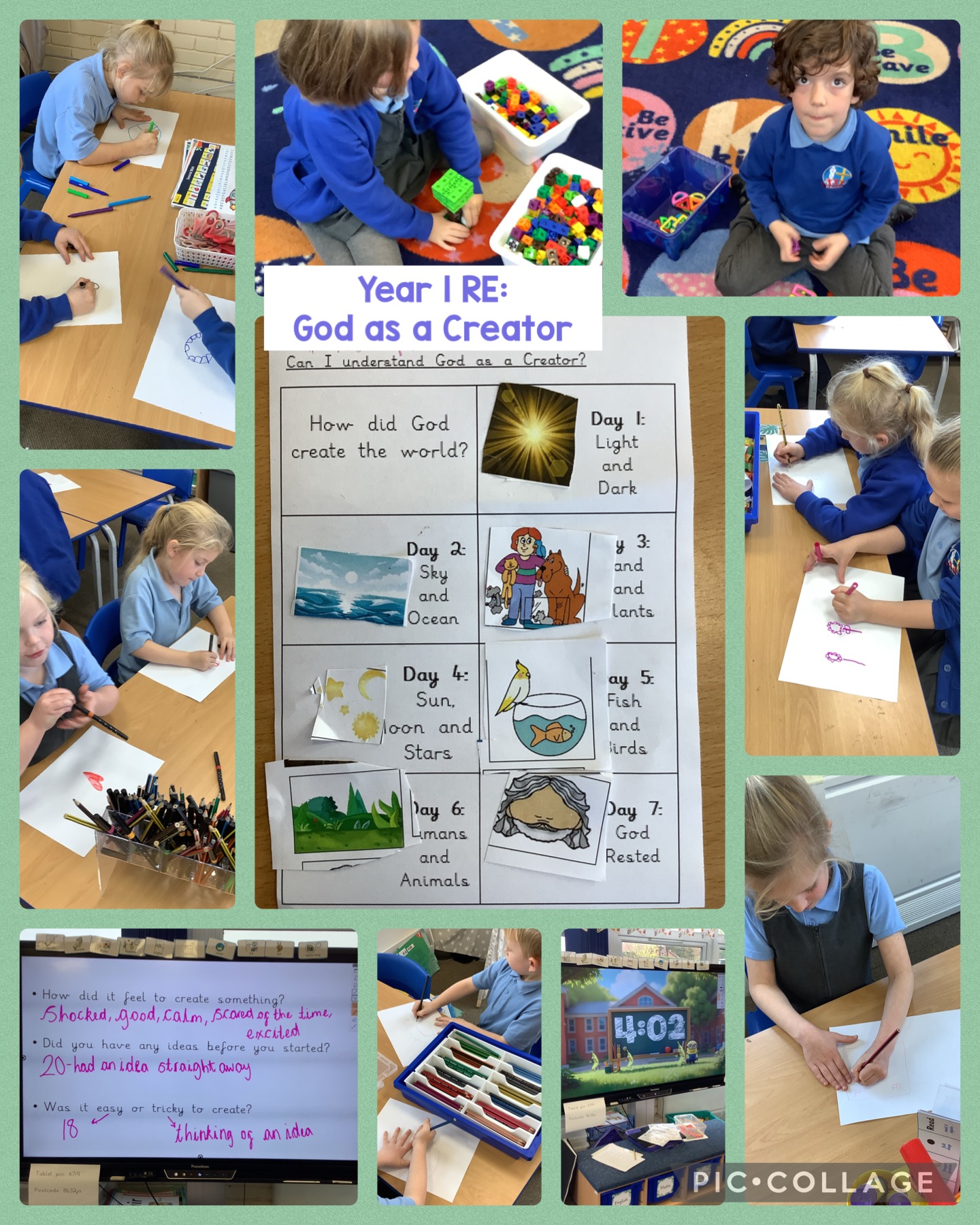 This afternoon, we started our new topic about Creation. The children had 5 minutes to create anything they could choose, either drawing something or building something. They then thought about how they felt when they are creative, whether they found easy or tricky and if they had an idea straight away or if their idea changed whilst they were making something. Then we learnt about the Creation story in the Bible. It took God 7 days to make our earth and all of the living things. We then sequenced the story to solidify our understanding.