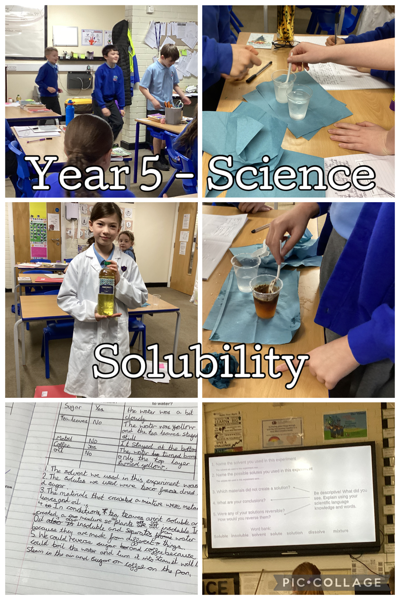 In science, Year 5 studied which materials are soluble and which are insoluble in water. We first considered how particles move when substances are dissolved, spreading out evenly through the water. Then we defined the terms solute, solvent and solution before carrying out a practical to observe how soluble coffee, sugar, tea leaves, metal and oil are.