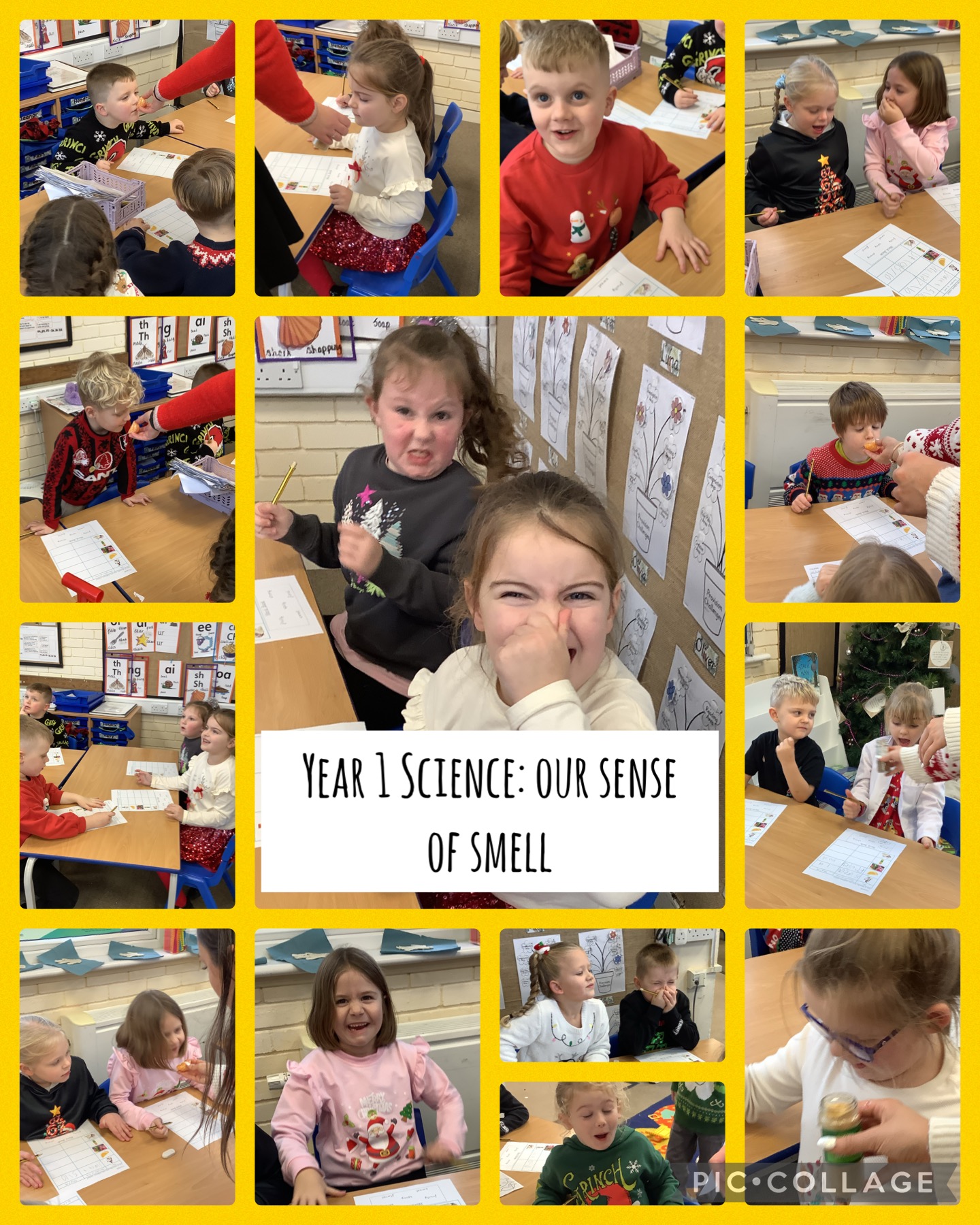 Yesterday, we learnt about our sense of smell. We discovered that we have small sensors in our nose which communicate with our brain for us to understand the odour of something. We also found out that without our sense of smell, we would not be able to taste as strongly. Our experiment was to smell vanilla extract, garlic, chilli flakes, an orange and flowers and describe them as either sweet, strong, spicy, fruity or floral. We also gave them a rating out of 10. Year 1 understood that to really smell something, they had to sniff hard as this sucks up the molecules into our nostrils.