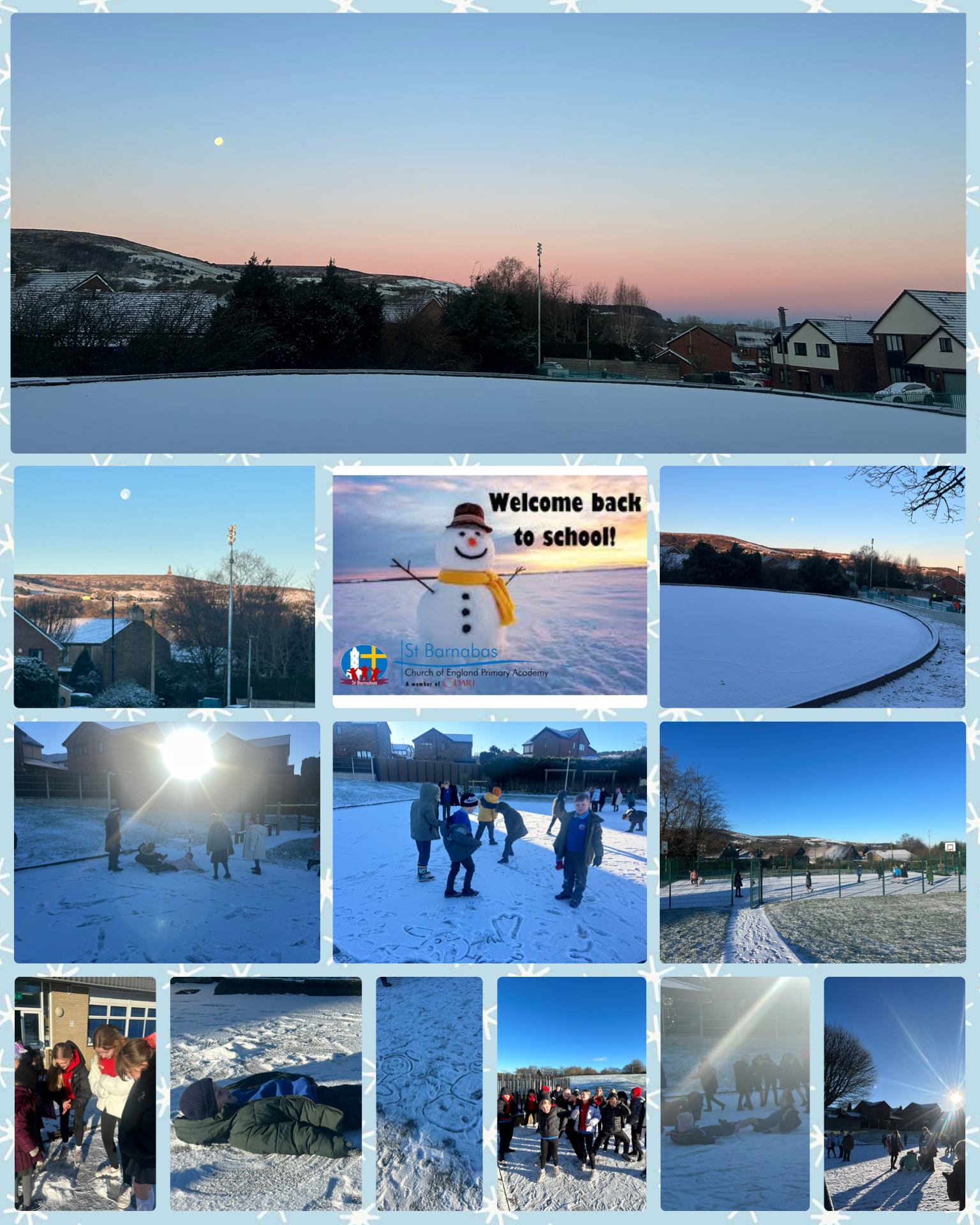 A huge welcome back to you all! It was a wonderful wintery view this morning from St Barnabas. It has been lovely to see the children reunited with their friends and they have especially enjoyed playing in the snow with them at break time.