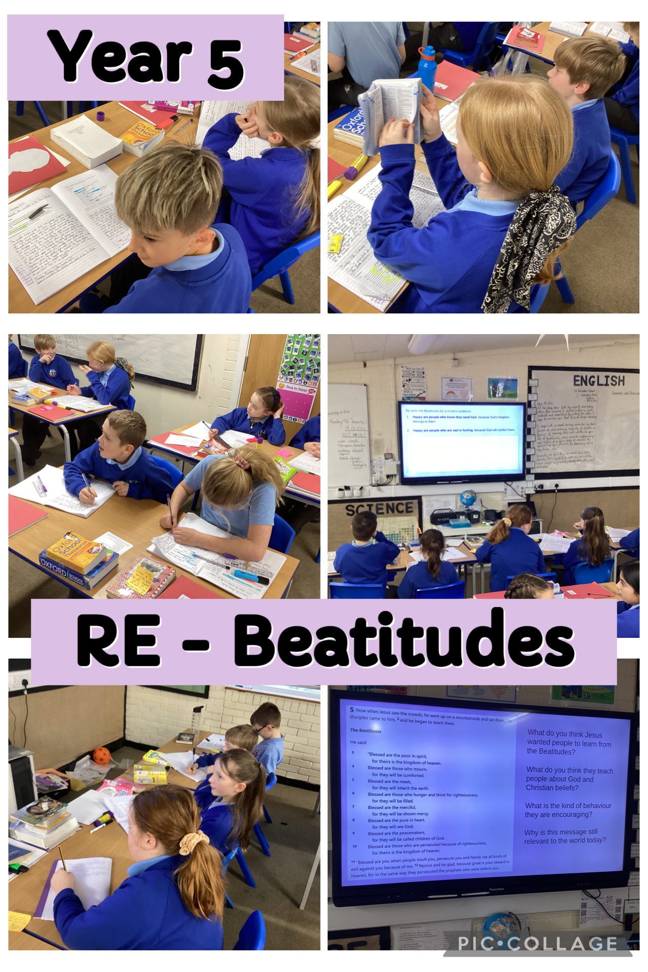In RE, we studied the Sermon on the Mount and the Beatitudes from the Gospel of Matthew. The Beatitudes are blessings Jesus gave to explain the character expected from Christians and include: trusting God through humility, forgiving and showing mercy to others as well as bringing peace to the world. The children considered what these Beatitudes mean for Christians today and re-wrote them for a modern audience.