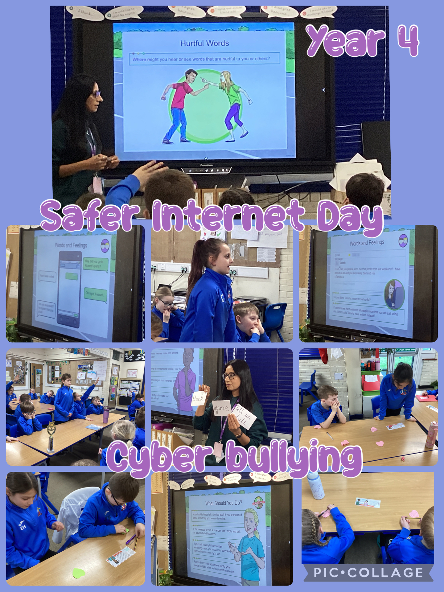 In Year 4, we spent Safer Internet Day focussing on a very common issue that many of our school family will probably experience as their internet usage increases: cyber bullying. The topic was introduced to the children sensitively with a look at what cyber bullying may look like. As a class, we read some hypothetical scenarios of unkind messages and shared how we thought the recipient might have felt. We then shared some examples of advice we could give to someone affected by cyber bullying. The children realised that there is a subtle difference between messages aimed at hurting others and those that can be misconstrued. The children were introduced to three options for resolving an issue: block, ignore and tell a trusted adult. They developed skills to help them think critically about what they see online.