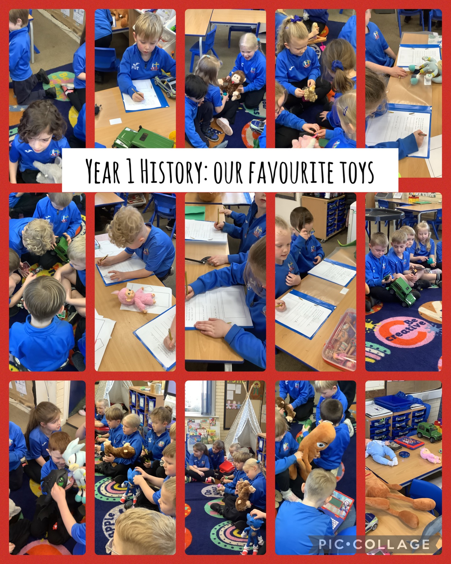 Today, we started our new topic in History: toys from the past. We started by bringing in our favourite toys from home and comparing these to pictures of old toys such as a ball and cup and wooden rocking horse. We noticed that our toys are mainly plastic and fabric materials. Then, we wrote about our favourite toys and shared them with each other to play together.