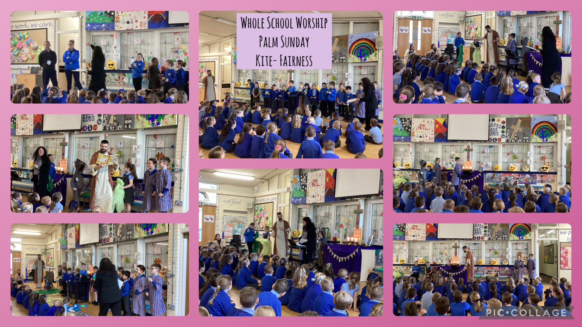 Our whole school worship began with signing the Trinity, bringing the whole school together in reflection. To explore the theme of our new Kindness Kite, Jack (Y5), Eliza (Y5), and Olivia (Y4) shared the Fairness Kite, which explained the biblical perspective on justice and treating others equitably. Mrs Ham asked the children to take a moment to reflect on everything we have done as a school to serve others who don't have as much as us. We looked back on our collective efforts to help those in need: Donating clothes, coats for the homeless, and teddies, which were organised by Year 5 Rotakids. Collecting food for Harvest and supporting the Darwen Enterprise Easter Egg appeal. Filling shoe boxes and raising money through sponsored walks. Worship continued with Mrs Ham reading a rhyming Palm Sunday Bible story about Jesus entering Jerusalem on a donkey, which the children and staff acted out brilliantly. Jesus and his friends were played by Charlie G, Peyton, and Mr Bloomfield. Zac (Year 1) played the donkey that carried Jesus into the city. Iris, Ava, and many other children acted as the crowd, waving palm leaves to welcome the King. Mrs Araujo and Mr Mealor played the Pharisees, representing the religious leaders who disagreed with Jesus and watched the parade with concern. To end our worship, we sang, 'We Have a King Who Rides a Donkey.' We left worship thinking about the example Jesus set and how we can continue to give in service to those around us.