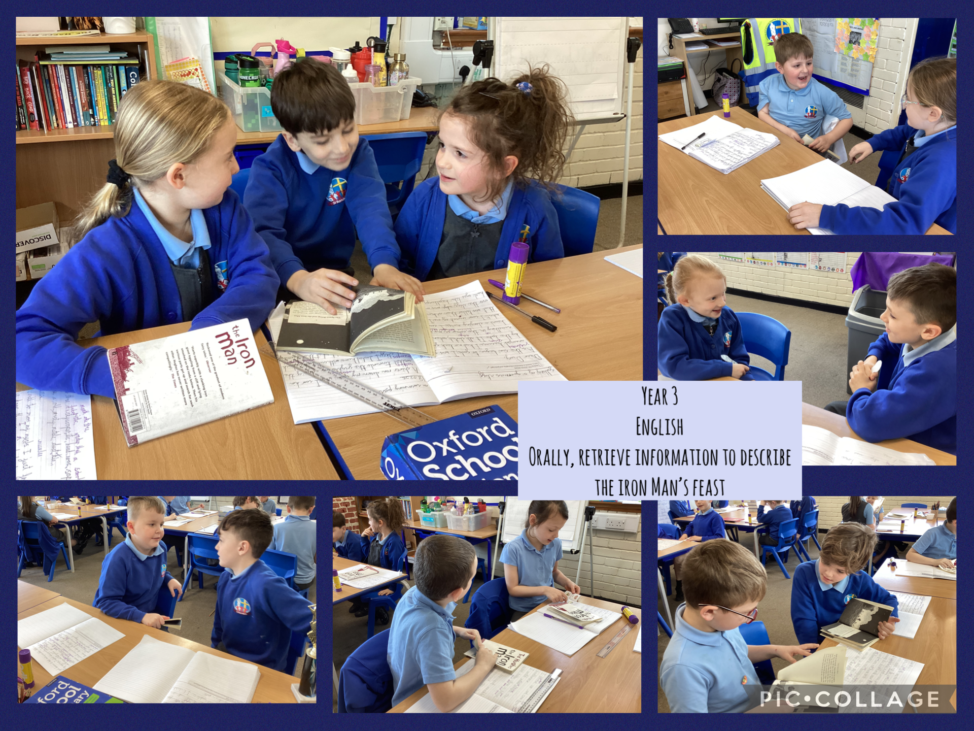 In English today, the class read Chapter 3 of The Iron Man together, focusing on the moment the Iron Man is lured into the scrap metal pit. Instead of writing in their books, the children spent the session developing their oral skills by describing the Iron Man's massive feast. They practised retrieving specific details from the text to build descriptive sentences out loud. It was a great opportunity for them to use talk tactics, such as building on each other's ideas and instigating new points of view, to bring the scene to life through high-quality discussion.