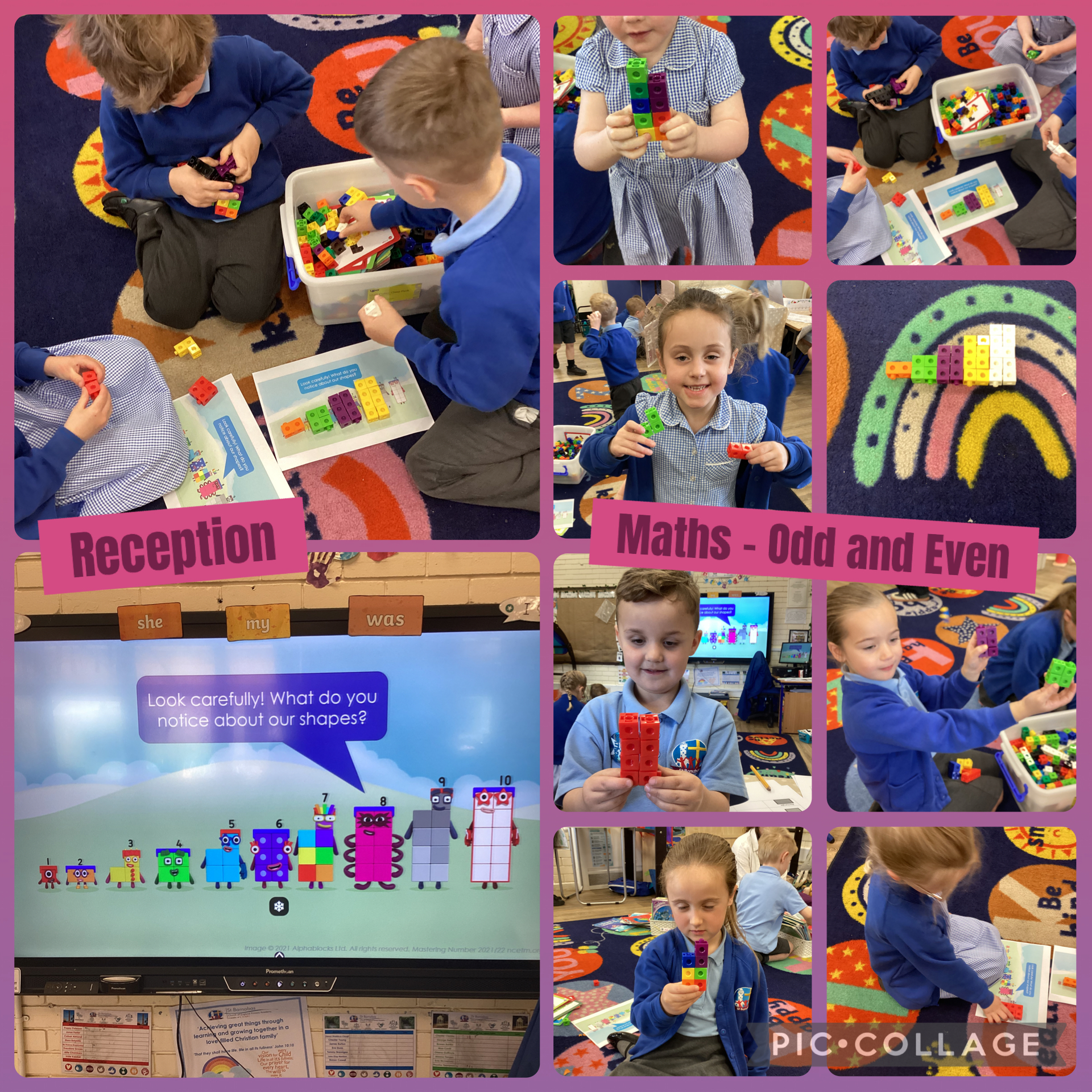 This week in Maths we have been introducing odd and even numbers. We looked at the numberblocks, splitting them into two groups of ‘odd blocks’ and ‘even tops’ - we looked carefully at the shape of the number blocks to help us to identify if they were odd or even, noticing the doubles that could be seen in the even tops.