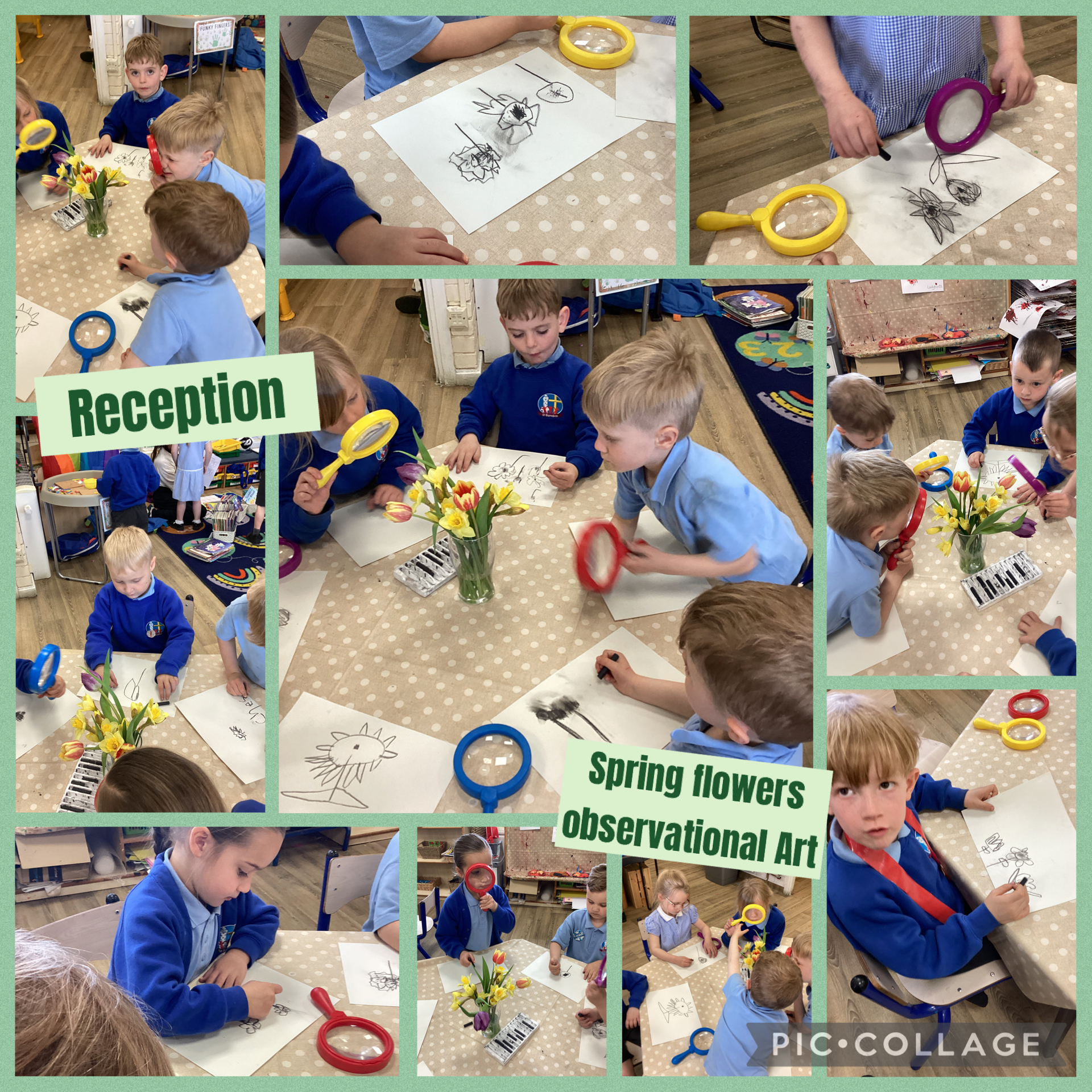 As part of our Spring topic this week, Reception have been looking at Spring flowers and have been developing their drawing skills using charcoal. The children looked carefully at daffodils and tulips, then applied different pressure on the charcoal to create light and dark tones.