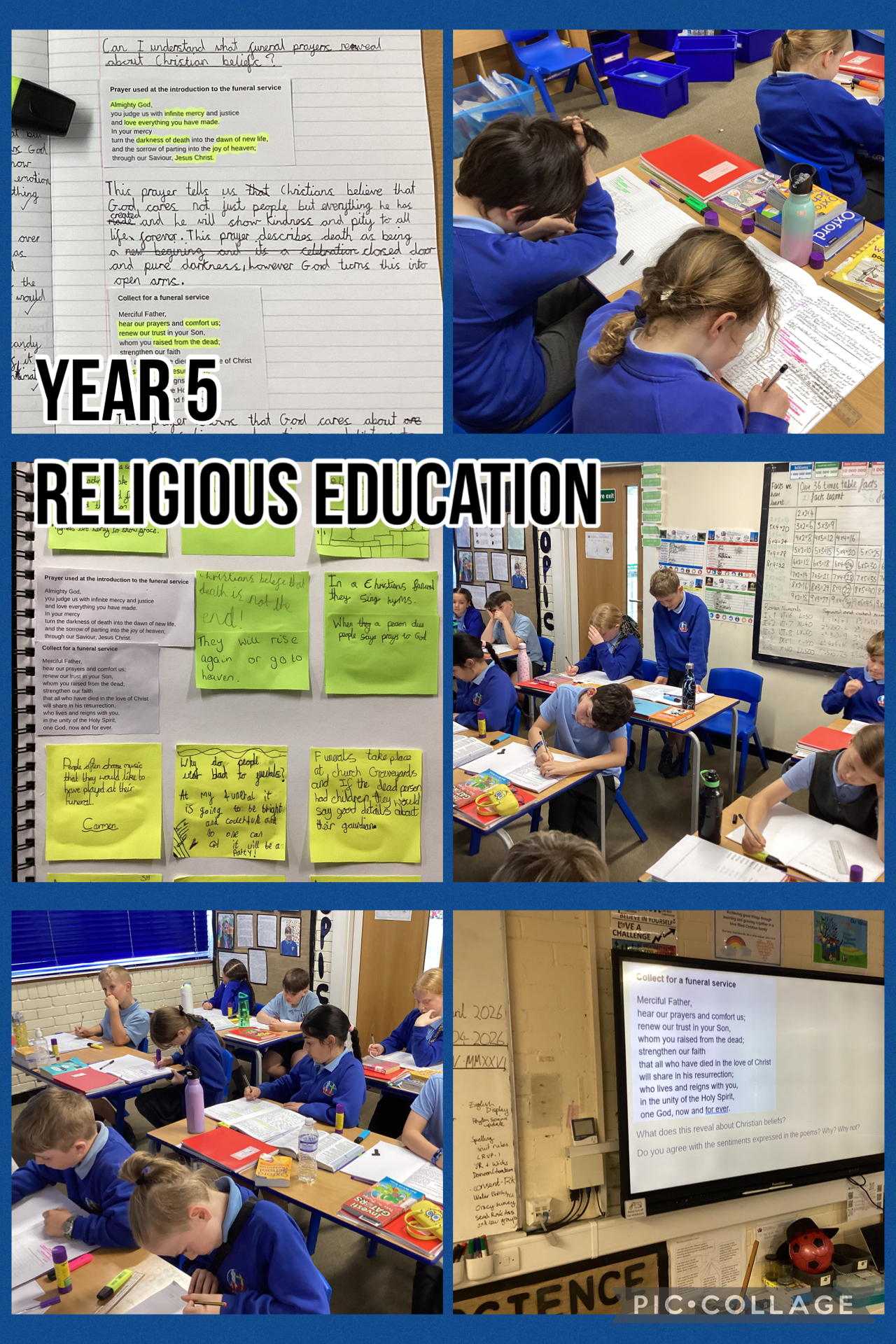 We started by discussing the children’s knowledge of what funerals are and why we have them. This is a sensitive topic and the children showed great maturity and sensitivity in sharing their experiences in an open, respectful manner. We then analysed Christian prayers spoken in funerals and considered what they tell us about Christian beliefs around God, Jesus and heaven.