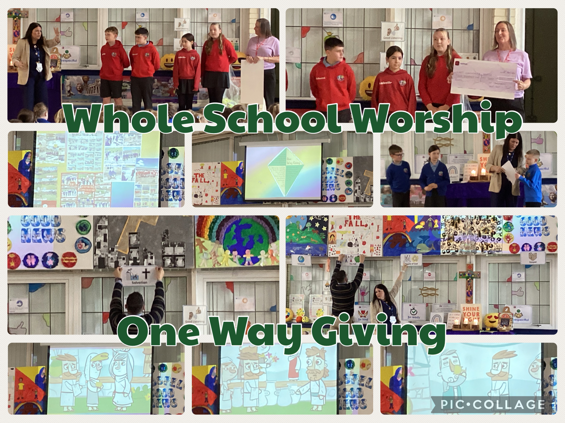 Mrs Ham then shared this week’s One Way Giving kindness kite. Three of our KS2 children volunteered to read the sections of the kite and we learned that the Bible says we should give in secret and God will reward us.