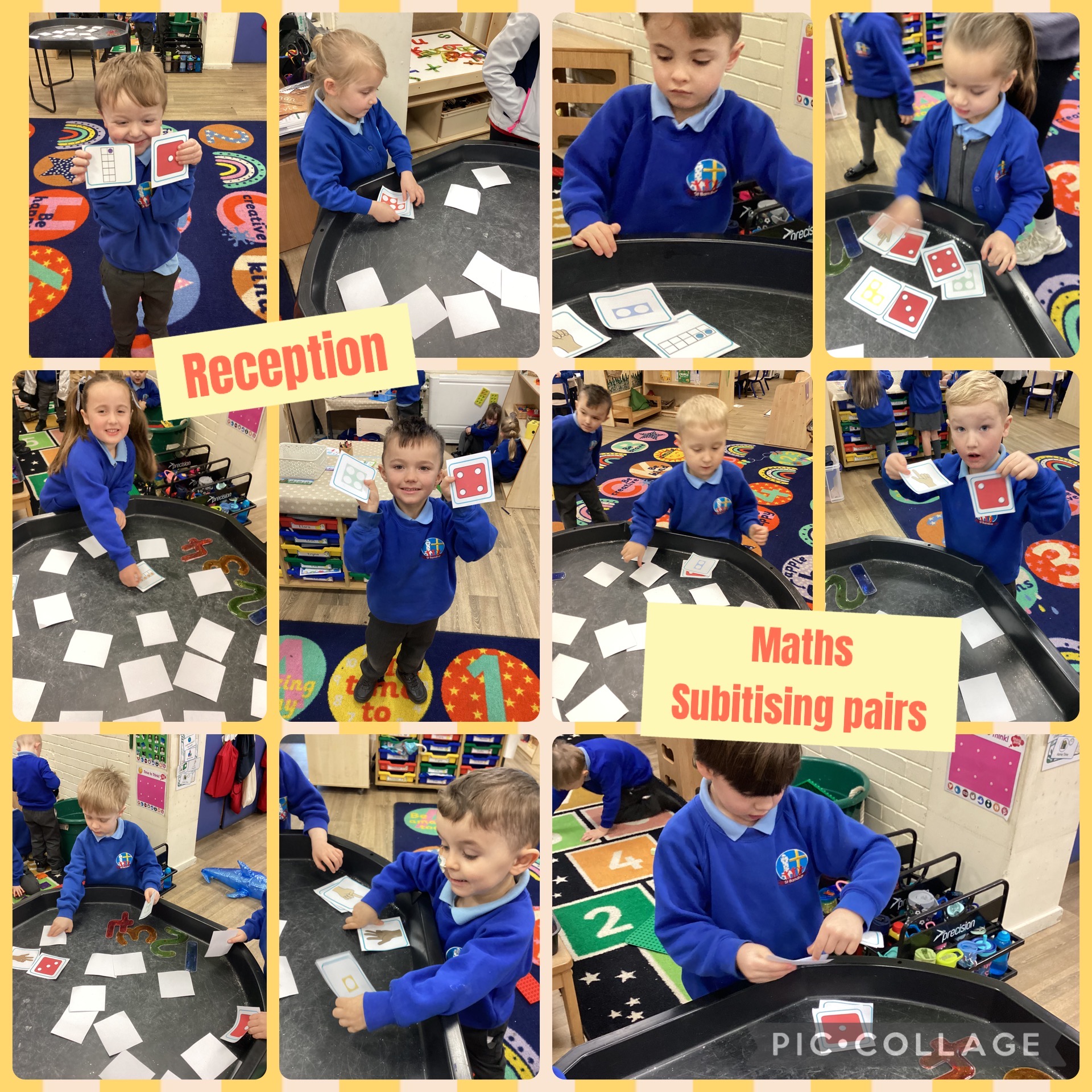 This week in Maths, we have been revisiting our subitising skills to 5. We have moved onto looking at different frames and arrangements to help us subitise quickly, e.g. fingers on our hand, spots on a dice and numicon pieces. The children then took turns to play a game of 'pairs' where they had to turn over different cards to see if they could subitise and find a matching pair. They were brilliant at spotting the equal amounts!