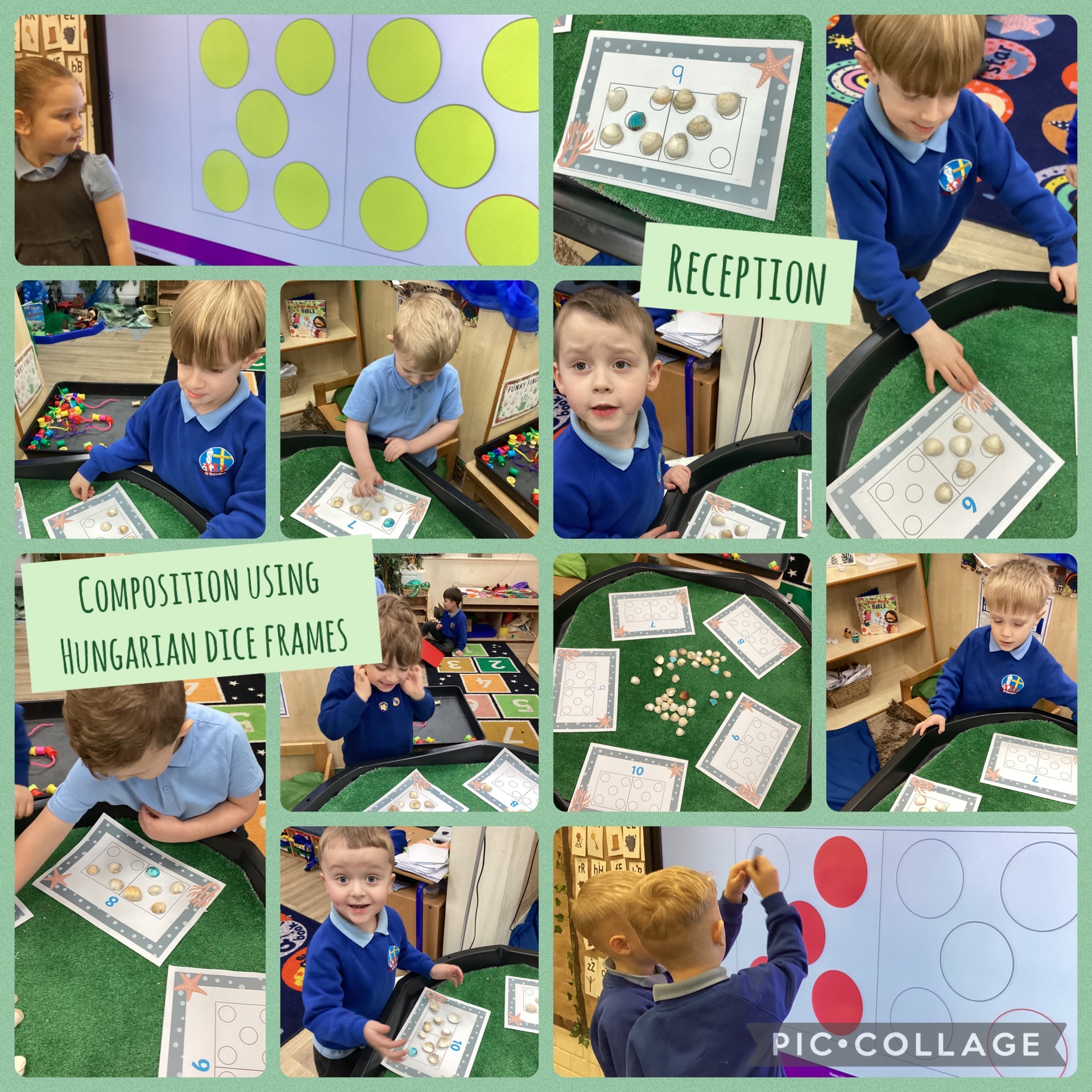 In today's Maths session, the children used double dice frames to explore the composition of numbers from 5 to 10. By filling one frame completely before starting the next, they practiced representing these values as "5 and a bit," such as seeing 7 as a full set of five plus two more. This approach helps children to move beyond simple counting, encouraging them to subitise and build a strong mental foundation for future addition and subtraction.