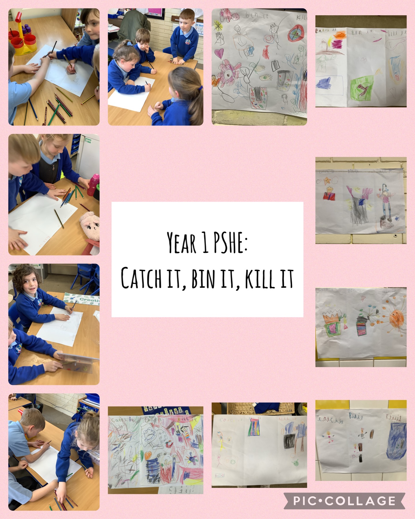 Year 1 continued to learn about the spread of germs and illness in PSHE. We watched a short video explaining that to keep hygienic we should follow 3 steps: catch it, bin it and kill it. We should catch our germs with a tissue, bin the tissue and wash our hands to kill the germs. To make our whole school aware of these rules, we worked in groups to create a poster for each class.